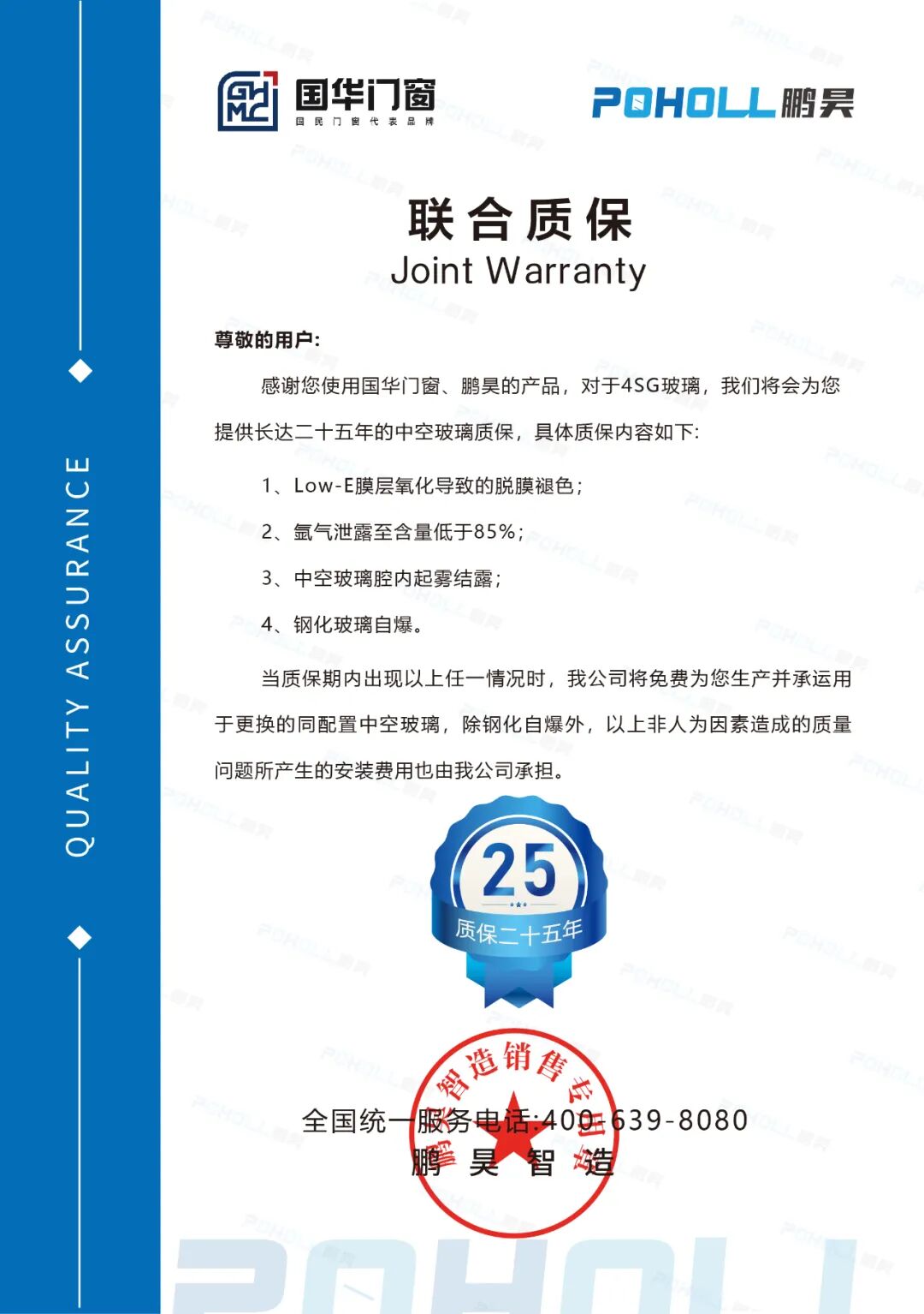 Још значајније, Гуохуа Доорс & Виндовс и Пенгхао су заједно покренули продужену гаранцију, дајући 4СГ стаклу 25-годишњу гаранцију на изолационо стакло. Ова посвећеност покрива неколико кључних питања, укључујући раслојавање и промену боје изазване оксидацијом Лов-Е филма, цурење гаса аргона испод 85%, замагљивање и кондензацију унутар шупљине изолационог стакла и спонтану експлозију каљеног стакла. Овако свеобухватна и дугорочна гаранција је ретка у индустрији и у потпуности показује поверење обе стране у квалитет производа и њихову дубоку посвећеност купцима.